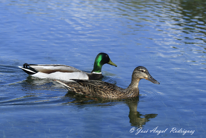 -Los ánades reales o azulones (Anas platyrhnchos): son unos patos muy comunes en nuestras aguas. Los machos, con su inconfundible cabeza azul que según le de la luz se puede tornar verdosa, poseen un plumaje mucho más colorido que las hembras, de colores más sosillos las pobres. Esto en zoología se llama dimorfismo sexual, es decir, según cual sea el género del individuo, presentará unas características externas u otras (como ocurre con nosotros, los humanos).