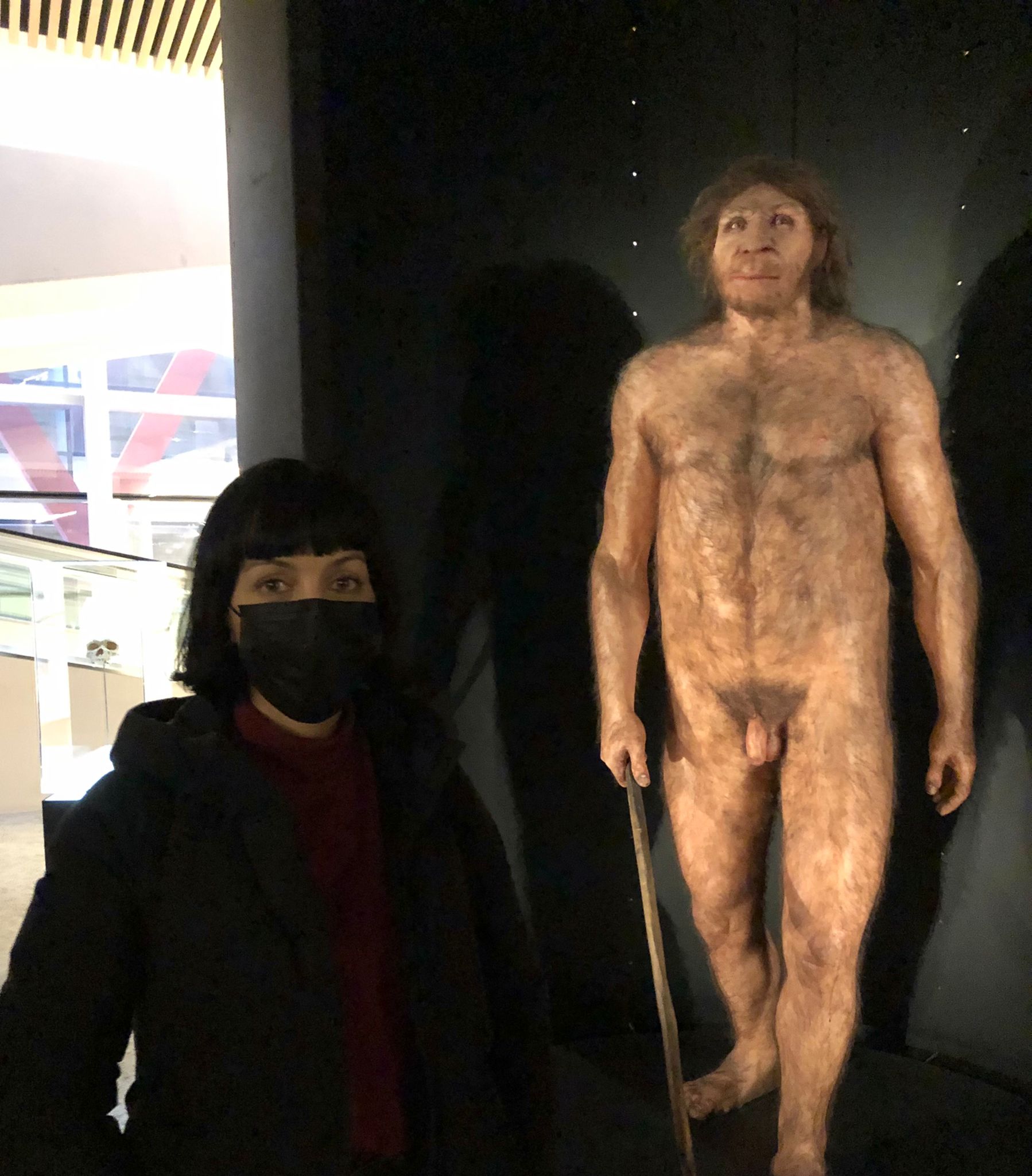 Ya por la tarde visitamos el Museo de la Evolución Humana (MEH) en Burgos, otro gran centro de cultura científica que apuesta por una divulgación moderna, participativa e interactiva. Es un museo bastante grande que cuenta con visitas guiadas. Nosotras lo vimos por nuestra cuenta, porque al haber estado por la mañana en Atapuerca el museo era básicamente una ampliación de lo que nos habían explicado y no nos hizo falta la guía. Pudimos ver una exposición de ilustraciones de Santiago Ramón y Cajal, el cráneo número 5 y la pelvis «Elvis», varios fósiles de la Chica de la Gran Dolina, una muestra de cómo surgió la agricultura y cómo vivían las sociedades neolíticas en Atapuerca, diversos tipos de herramientas de piedra, etc. En la Galería de las Estatuas me encontré con un risueño Miguelón.