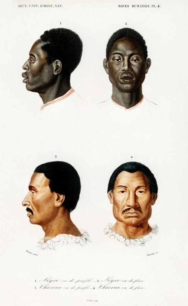 Ilustración del naturalista Charles Dessalines D’ Orbigny (S. XIX) que muestra a dos personas, una negra y otra amerindia, incluida en el «Dictionnaire universel d’histoire naturelle» (Fuente)