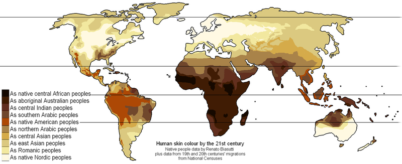 Distribución del color de piel en la actualidad. Como veis, la gente se ha mezclado mucho (Fuente)