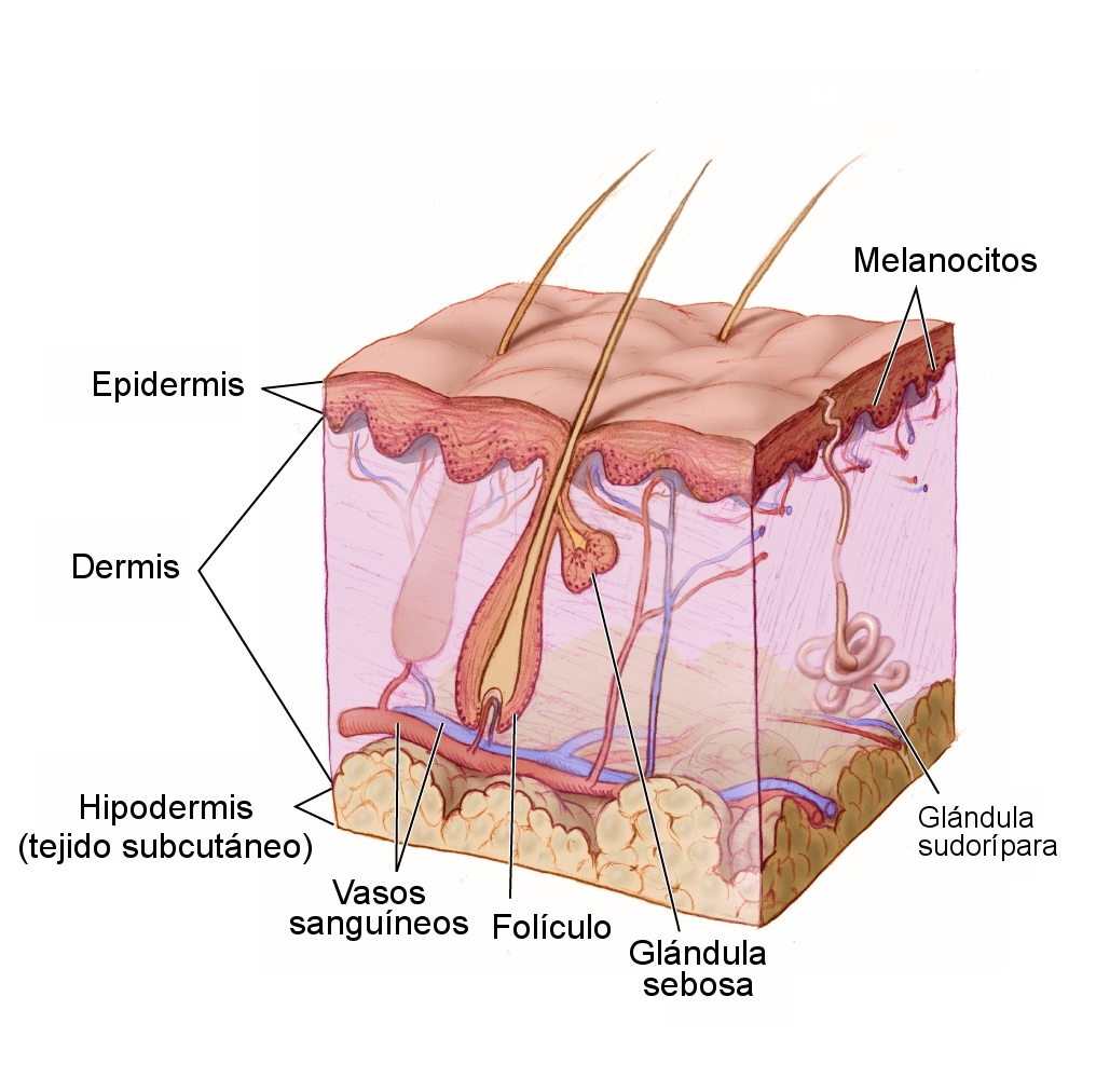 Esta capa de la piel se encuentra entre la epidermis, la capa externa que hace las veces de barrera, y la hipodermis, la capa más profunda, que contiene sobre todo células grasas. En la dermis hay fibras nerviosas, glándulas sudoríparas, folículos pilosos y vasos sanguíneos y linfáticos. A través de los vasos llegarán los responsables de fijar la tinta del tatuaje: los macrófagos.