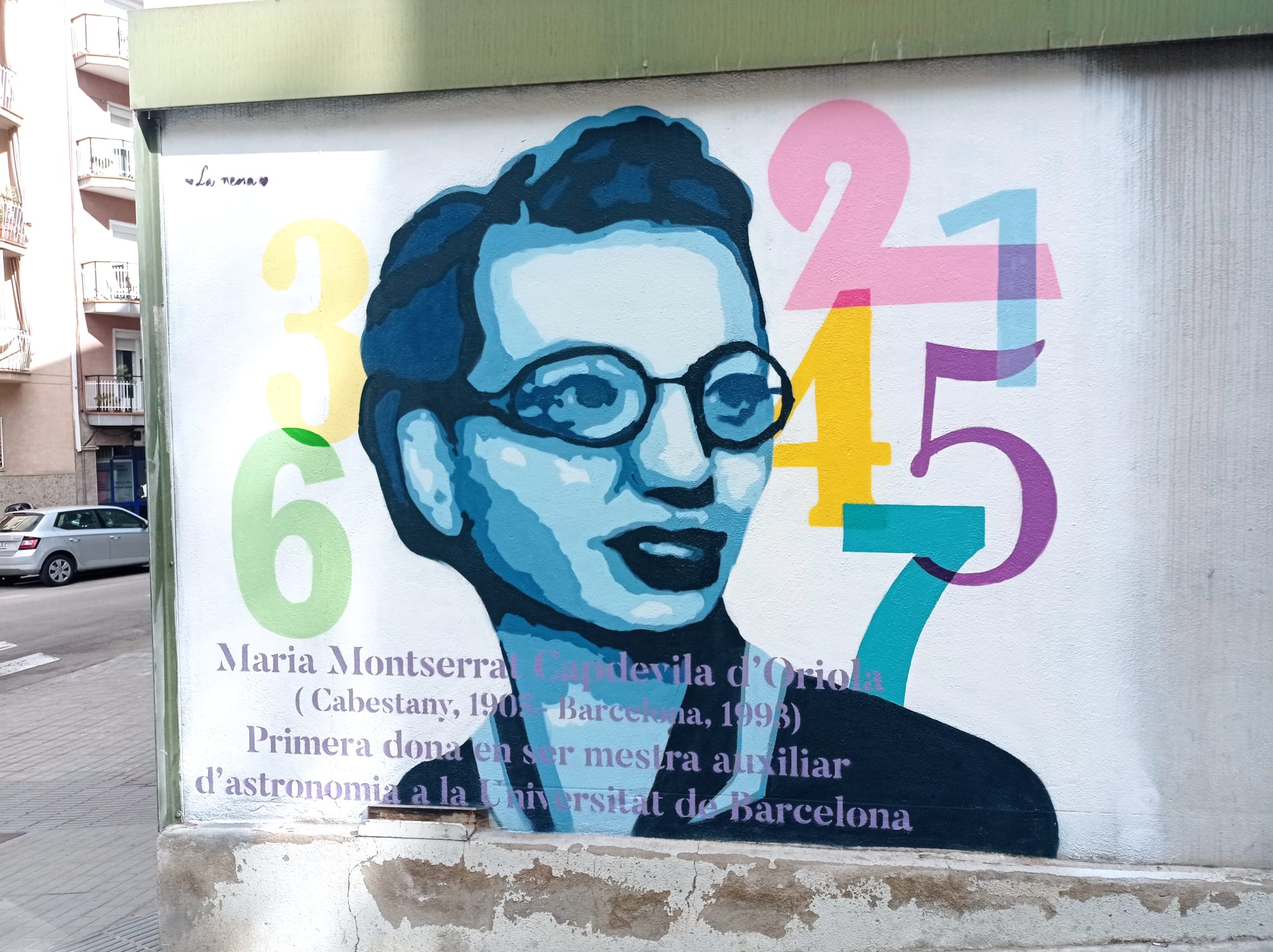 Mural realizado en la Escola Calderón de la Barca (Barcelona) por la artista Raquel Ruiz dedicado a Maria Capdevila d’Oriola, primera mujer profesora auxiliar de Astronomía de la Universitat de Barcelona. La pieza forma parte del proyecto «CientífiqArt», iniciativa del Grupo de Perspectiva de Género en Ciencia de la Associació Catalana de Comunicació Científica (Más información)